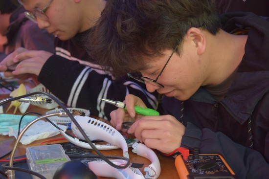 义务维修活动开始后,维修棚前陆陆续续有同学前来咨询或拿来耳机、鼠标、电风扇、台灯、热水壶等20多件需要维修的电器。志愿者对这些需要维修的物品做好登记,电子协会成员便开始进行维修,修好后及时通知物主前来领取,未能及时修好的物品将会带到电子开放实验室进一步维修。活动期间志愿者们还为过往的同学普及用电安全,分发用电安全传单。