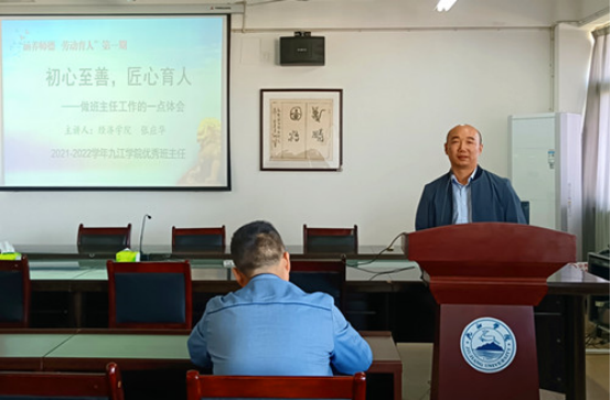 张应华博士主讲的题目是《初心至善,匠心育人---——做班主任工作的一点体会》。张博士从四个方面分享了做好班主任工作的经验:一是端正对班主任工作的认识;二是争做班级同学的良师益友,三是培养班级同学的自我管理能力;四是管好班级同学的关键少数(二八原理)。