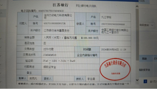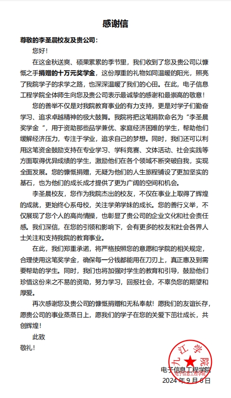 本学期开学后,经朱科长联系,校友李圣晨慷慨捐赠,于9月6日完成了捐款。BB贝博艾弗森也向李圣晨发出了感谢信,并邀请李校友抽空回校办理捐赠仪式。