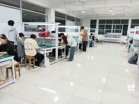 理论学习结束后,培训进入实践焊接环节。实训教室内,300余名新生分为19个小组,分两批进行实践焊接,每组配备1名骨干成员提供指导。骨干们提前为每组准备了LM317芯片、电阻、电容、电路板等全套器材,并示范了电烙铁使用方法、焊接操作规范及安全注意事项。“焊接时温度要控制在300-350℃,焊点要圆润饱满,避免虚焊、漏焊。”骨干成员吴同学一边演示,一边提醒新生注意安全细节。新生们手持电烙铁,小心翼翼地进行元件焊接,遇到问题及时向骨干请教。对于焊接操作不熟练的新生,骨干们手把手指导,帮助他们掌握正确的焊接技巧。