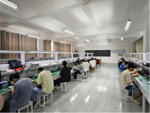 图8 参赛选手在电子信息实验楼402室集中焊接调试