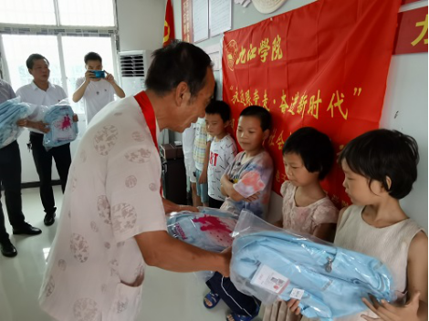党课结束后,开展“我为群众办实事”实践活动,关爱家庭经济困难儿童。高飞老师、李强良副书记、高万保爷爷将爱心书包、铅笔、橡皮等学习用品分别送到了新镇社区8名家庭经济困难的儿童手中,用实际行动温暖孩子们,并鼓励他们做一名尊敬师长、孝敬父母、团结同学、热爱学习的好孩子,感恩党和祖国的关怀,长大后用所学的知识回馈社会,服务人民。同时,服务队同学们还通过开展开展趣味游戏、制作手工、辅导功课等方式了解了儿童们的生活、学习状况,帮助他们解决学习中遇到的困难,尽力帮助他们的健康成长。