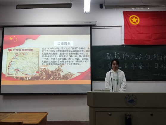 活动伊始,各班团支书向同学们介绍了本次活动的具体内容以及长征精神的深刻意义。为了让长征故事更加鲜活明了,主持人精心准备PPT,穿插了图片和视频向同学们声情并茂的讲述了红军战士血染湘江、四渡赤水、飞夺泸定桥、翻越雪山、跋涉草地等长征故事,展示了红军长征路上的艰辛,使同学们体会红军战士坚定的意志和必胜的决心。同学们纷纷表示,红军战士以自己血肉之躯铸造了伟大的长征精神,我们青年大学生要接过长征精神的光辉旗帜,适应时代发展的要求,锐意进取、自强不息,真正把爱国之志变成报国之行。