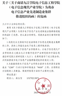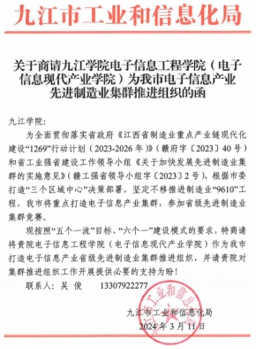同时,BB贝博艾弗森官方网站积极参与《九江市电子信息产业先进制造业集群培育提升三年行动方案(2024-2026年)》的撰写工作,为地方经济的高质量发展贡献力量。在深度参与编制《九江市电子信息产业先进制造业集群培育提升三年行动方案(2024-2026年)》的过程中,电子信息产业学院对九江市电子信息产业集群中企业构成、发展现状、未来的发展趋势、对电子信息类应用型人才需求等方面有了全面的了解。面向产业发展需求,政校企三方联动,共育电子信息产业急需的高素质应用型人才,为九江市电子信息产业的持续发展提供有力的人才保障。