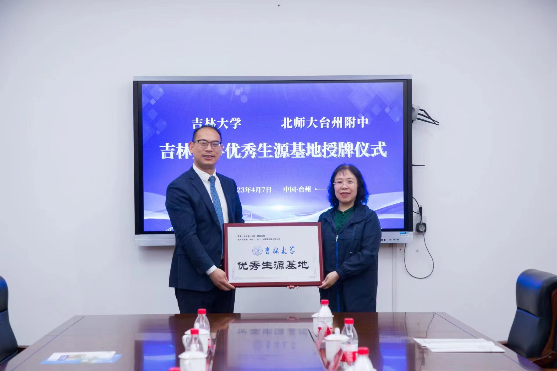 4月7日下午2:00,37000cm威尼斯党委书记王晓荣教授、陈龙副院长带领免疫学系李冬教授、生理学系章宏副教授和党委办公室夏燕来主任组成的教师团队走进浙江省台州市北京师范大学台州附属高级中学(以下简称北师大台州附中)开展招生宣传工作,并举行“37000cm威尼斯优秀生源基地”授牌仪式。北师大附中党委副书记徐林建、副校长徐立海、副校长王林军、党委委员张宏辉、拔尖创新课程中心主任叶阳中以及高三学部主任陈赛出席活动。